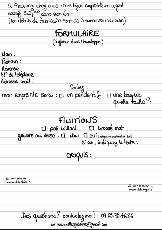 Une fois votre empreinte prise, la remettre dans sa boite. Vous avez le choix de venir l’apporter à l’atelier ou l’envoyer dans l’enveloppe affranchie présente dans le kit. N’oubliez pas d’y glisser le formulaire avec vos coordonnées et vos instructions.